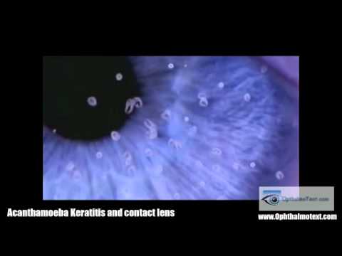 • Nhiễm trùng hoặc loét giác mạc do kính không khớp hay do không theo đúng các nguyên tắc vệ sinh khi sử dụng kính áp tròng. Tỷ lệ nhiễm trùng giác mạc liên quan tới sử dụng kính áp tròng vào khoảng 2-4/ 10.000 người sử dụng, và cao hơn khoảng 5 lần ở những người sử dụng kính có thời dan đeo dài (extended wear). Tác nhân gây nhiễm trùng thường gặp gồm có trực khuẩn mủ xanh Pseudomonas spp., Klebsiella spp, nhưng nguy hiểm nhất là Acanthamoeba , một loại amíp có mặt trong các nguồn nước ngọt (ao hồ, nước máy, v.v…), đất và phân động vật/người có khả năng gây nhiễm trùng giác mạc, gây đau mắt dữ dội, mắt nhậy cảm với ánh sáng, chảy nước mắt dữ dội, nhìn mờ. Bệnh tiến triển thường gây sẹo đục giác mạc, rất nguy hiểm cho thị lực và thường là nguyên nhân dẫn tới thay giác mạc.